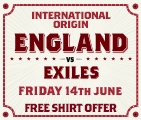 Quote RLFANS News Hound="RLFANS News Hound"Exiles Match - Free Shirt OfferEngland take on the Exiles on Friday 14 June at The Halliwell Jones Stadium, Warrington.